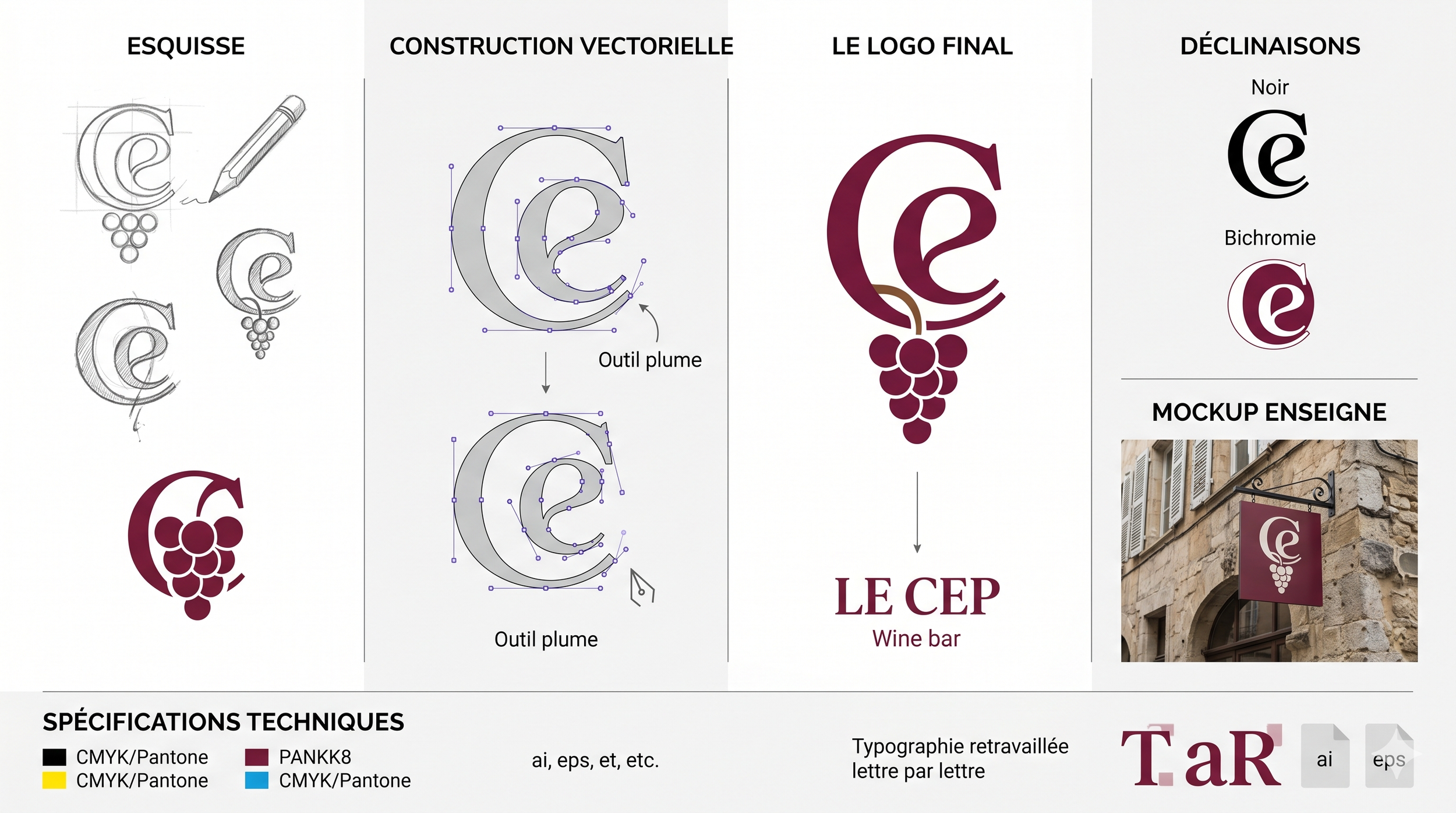 Monogramme construit à la plume de Bézier, typographie retravaillée lettre par lettre, déclinaisons en noir, bichromie et sur enseigne. Un cas d'école du logo vectoriel, de l'esquisse au fichier imprimeur.
