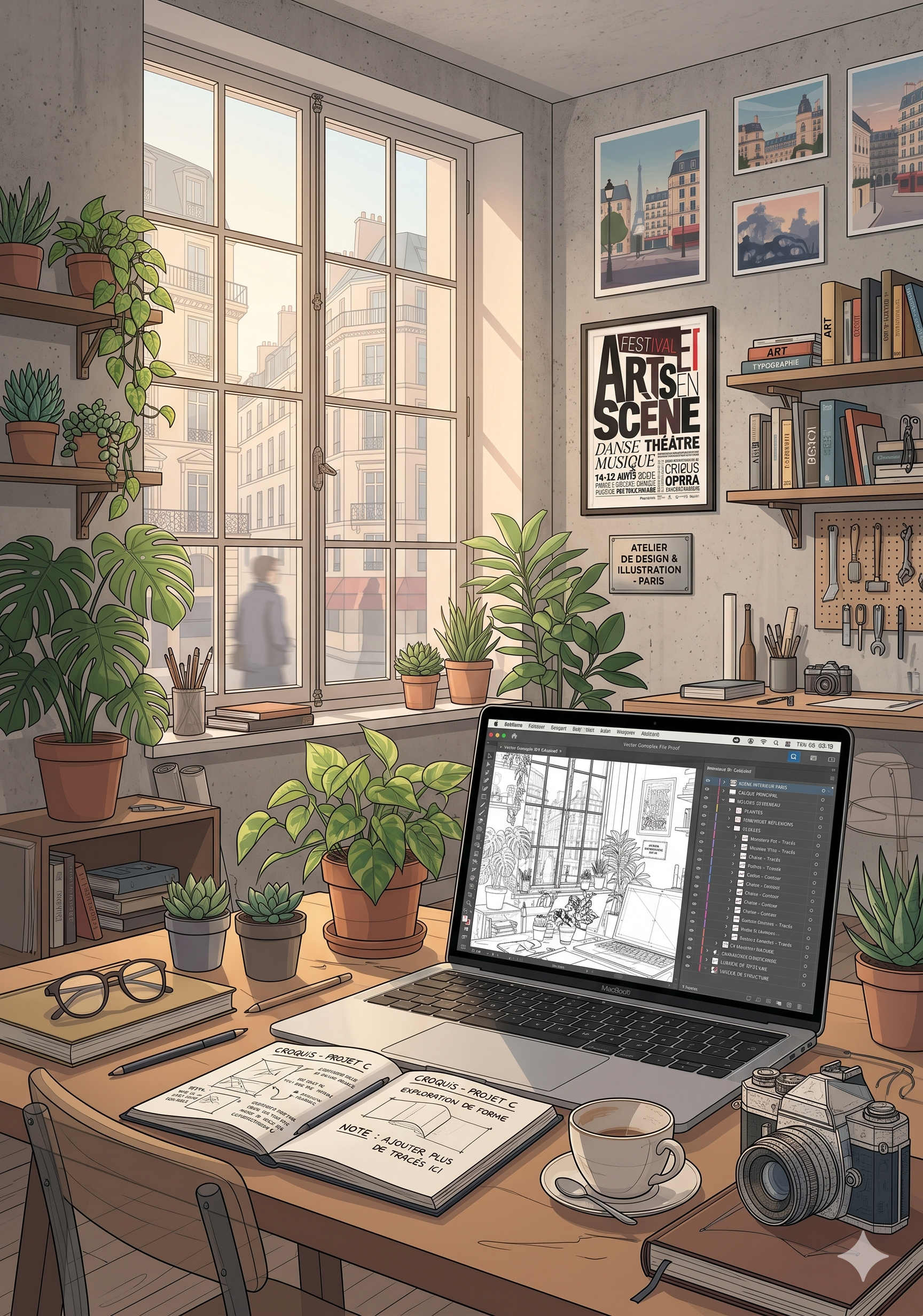 Scène d'intérieur stylisée, riche en détails : plantes, reflets de fenêtre, nuances de lumière du matin. Près de 400 tracés organisés dans un système de calques impeccable — la preuve qu'un fichier complexe reste lisible.