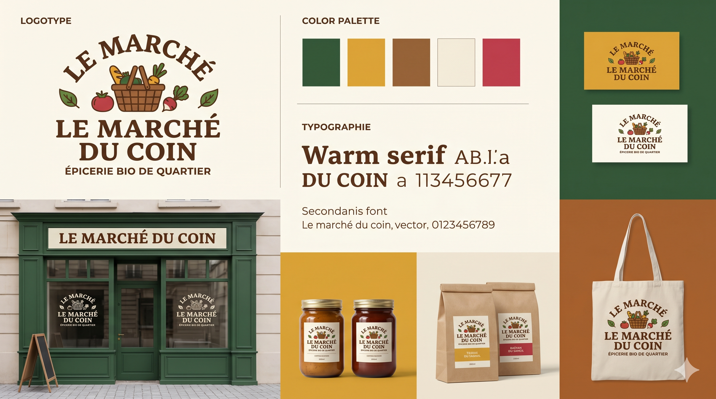 Branding d'une épicerie bio de quartier : logo, palette, typographie, applications (carte de visite, étiquettes produits, enseigne). Un livrable bout en bout, prêt à être présenté à un vrai client.