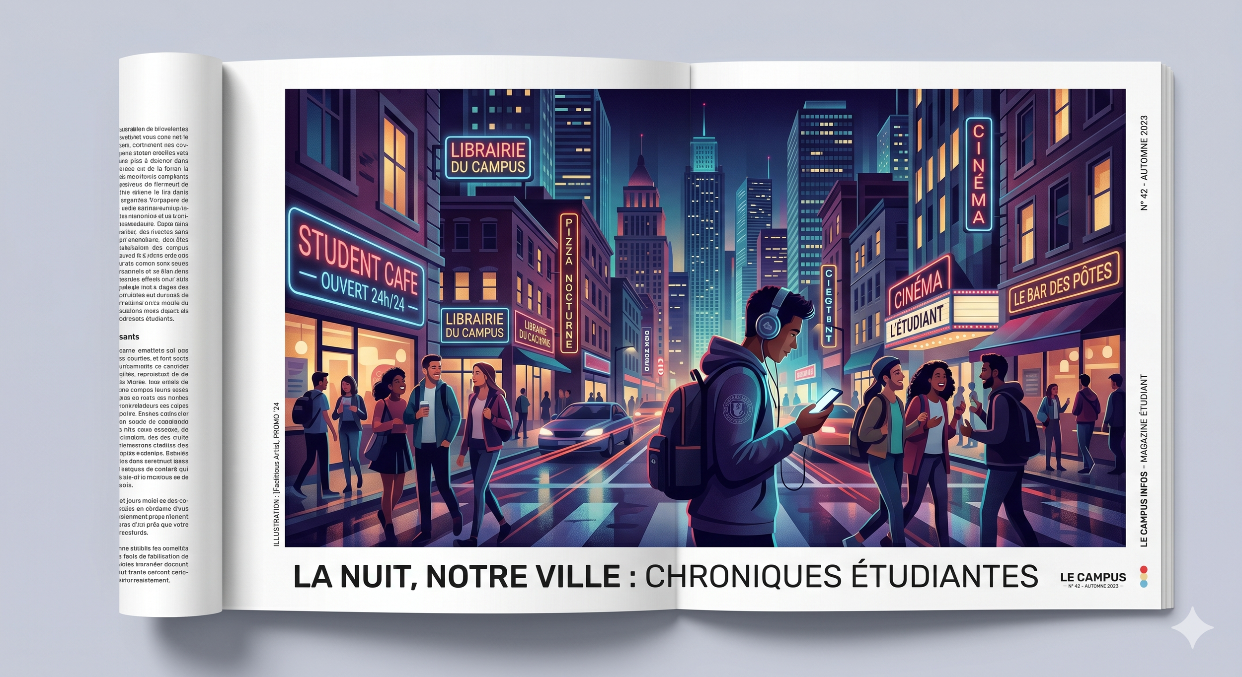 Scène nocturne urbaine, composée intégralement en vectoriel. Maîtrise des dégradés complexes, des masques d'écrêtage et de la narration visuelle. Publiée dans le magazine étudiant de la promotion.