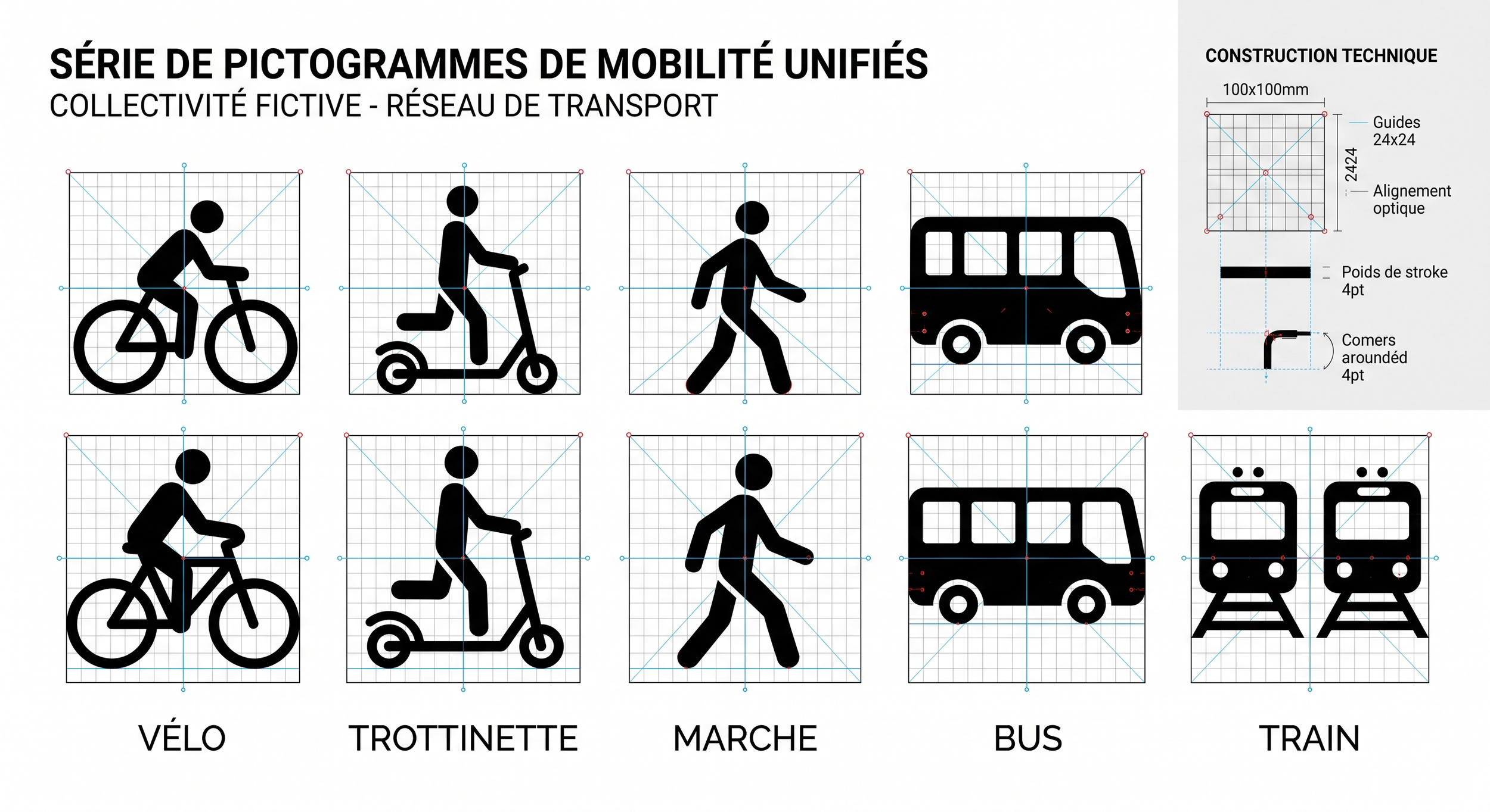 Pictogrammes cohérents pour une collectivité fictive : vélo, trottinette, marche, bus, train. Travail sur la grille de construction, l'alignement optique et le langage visuel unifié à travers toute la famille.