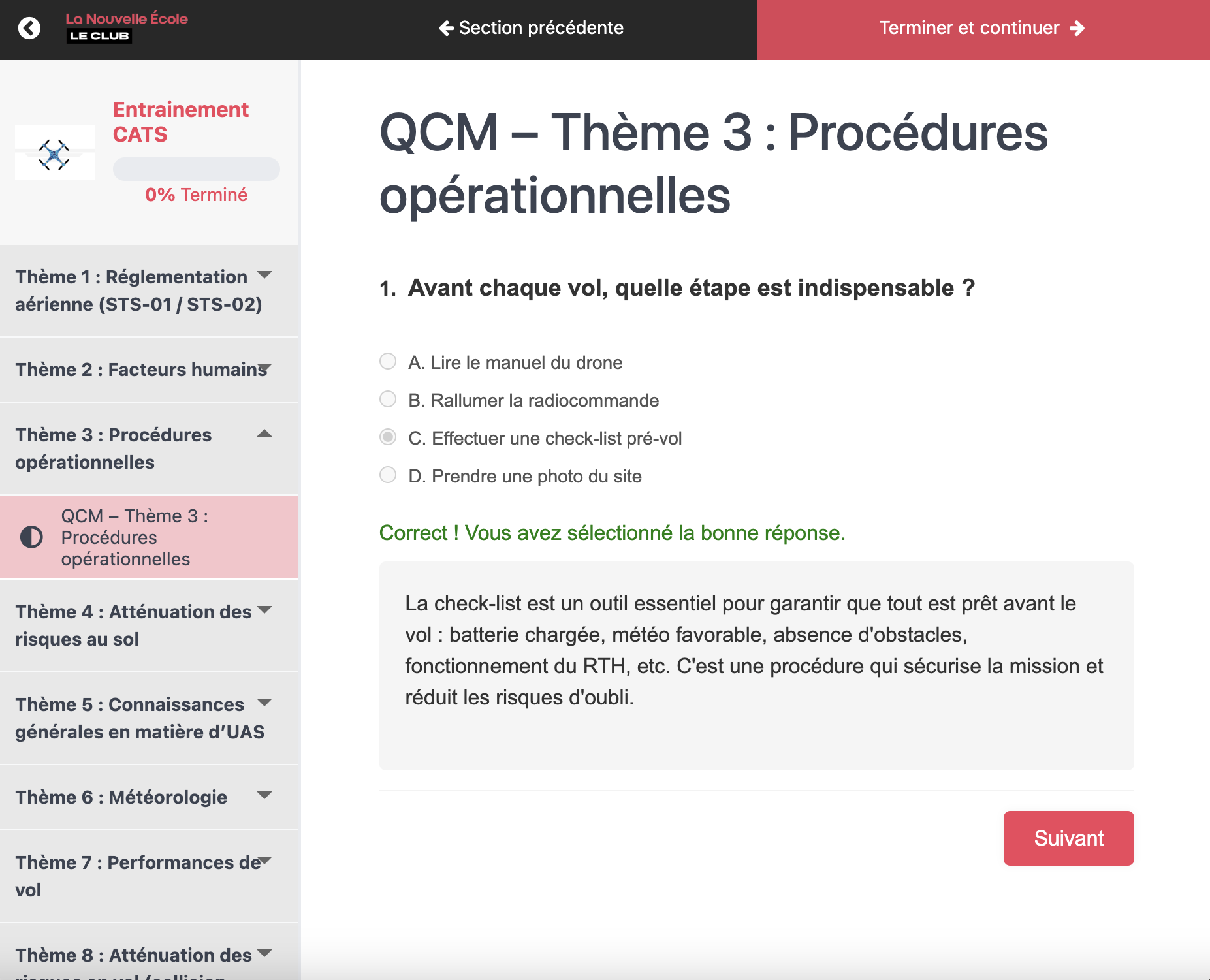 Nos contenus de révision sont conçus par des experts du télépilotage et suivent le programme officiel de la DGAC. Vous accédez à des QCM thématiques, des examens blancs conformes à l’examen réel, et des explications pédagogiques pour comprendre vos erreurs. L’objectif : vous permettre de progresser efficacement, de renforcer vos acquis et de maximiser vos chances de réussite au CATS dès le premier passage.